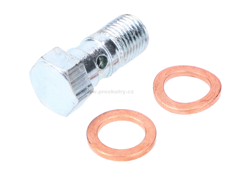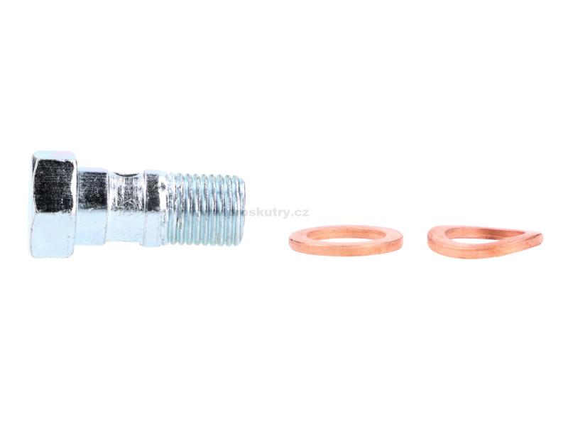 Šroub brzdového potrubí M10 x 20 mm (MF10x1x22 mm) vhodný pro Zündapp KS 50, KS 80 a mnoho dalších modelů. Součástí balení jsou dvě měděné těsnicí podložky.