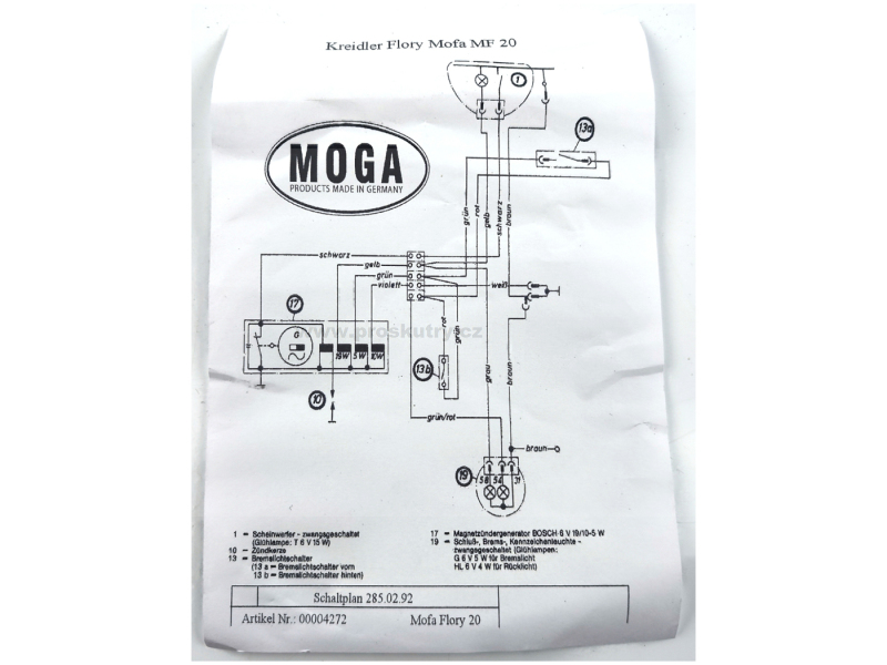 Kompletní kabelový svazek vhodný pro Kreidler Flory MF 20 a identický moped s brzdovým světlem. S instalačním plánem / schématem zapojení.