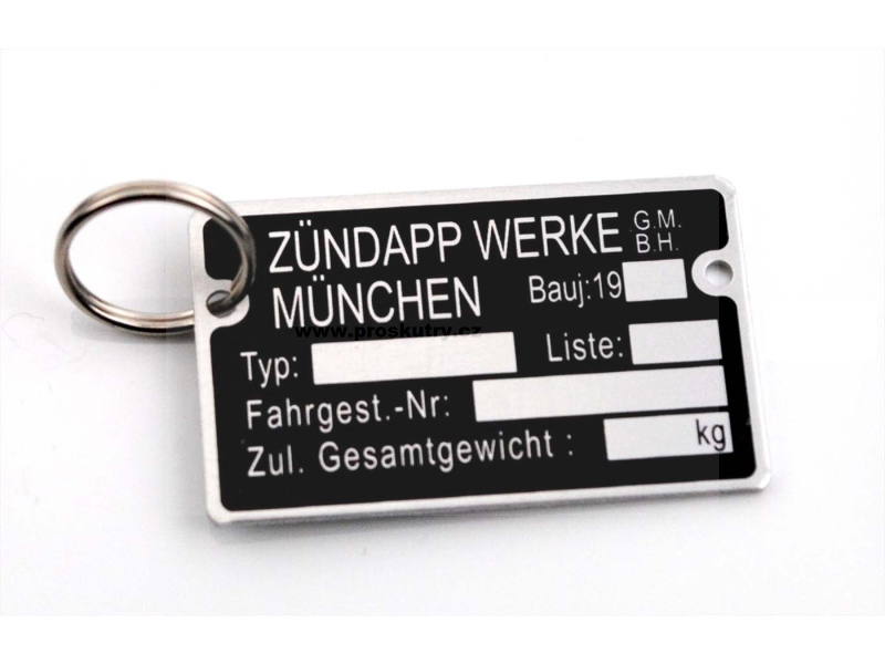 Prázdný štítek na klíčenku MOGA Zündapp ve špičkové kvalitě, vyrobený v Německu, s tloušťkou plechu 1 mm, dvakrát silnější než standardní štítek. Ideální pro personalizaci jmény, typy mopedů atd. Popisovací plocha je vysoká přibližně 3 mm a klíčenka má průměr přibližně 12 mm. Zadní strana může být použita pro gravírování, ražení čísel, ražení písmen atd. Rozměry štítku: šířka 40 mm, výška 24 mm.