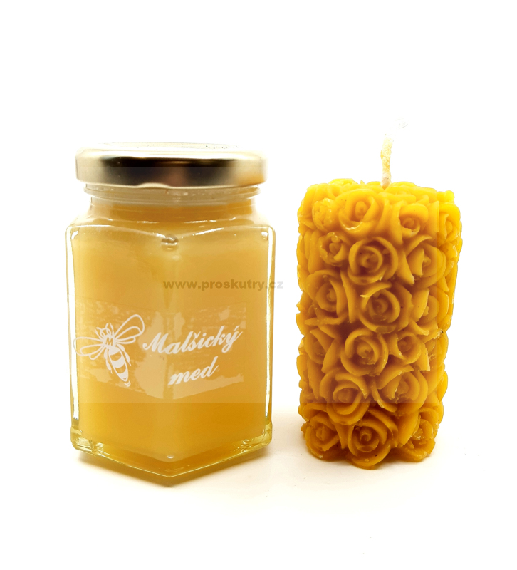 Obsah balení: malý med (140 g), růžičková svíčka ze včelího vosku
