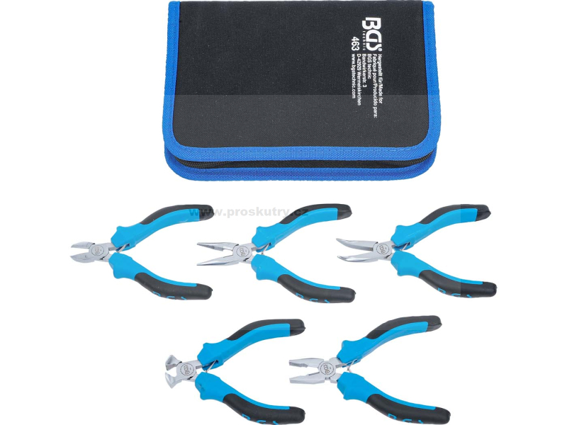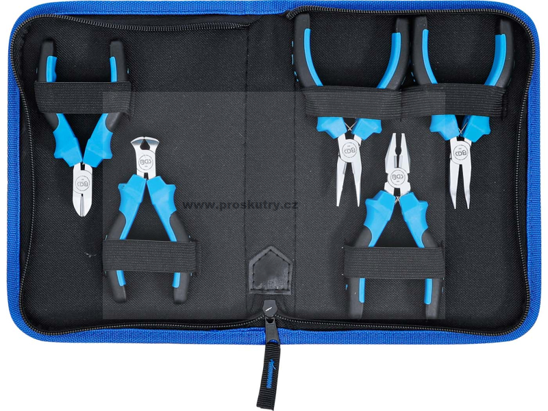 Kompaktní sada mini kleští, obsahuje 5 druhů: kombinace, rovné kleště, špičaté, štípací a ploché