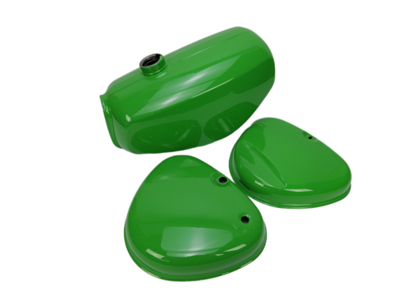 Kompletní sada palivové nádrže a vík schránek určená pro motocykly Simson S51 Enduro. Sada je ideální při renovaci motocyklu nebo jako náhrada poškozených karosářských dílů.