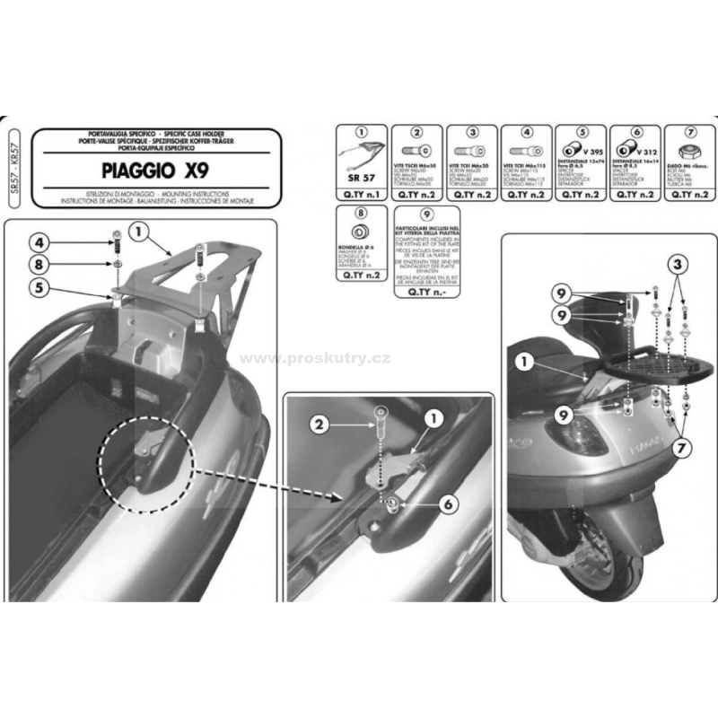 Nosič kufru Kappa KR57 je určen pro skútry Piaggio X9 125, 180 a 250 vyrobené v letech 2000–2002. Slouží jako pevný a bezpečný základ pro montáž horního kufru KAPPA. Konstrukce je navržena přesně pro daný model, což zajišťuje snadnou montáž bez úprav a dlouhou životnost.