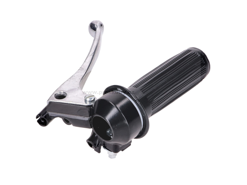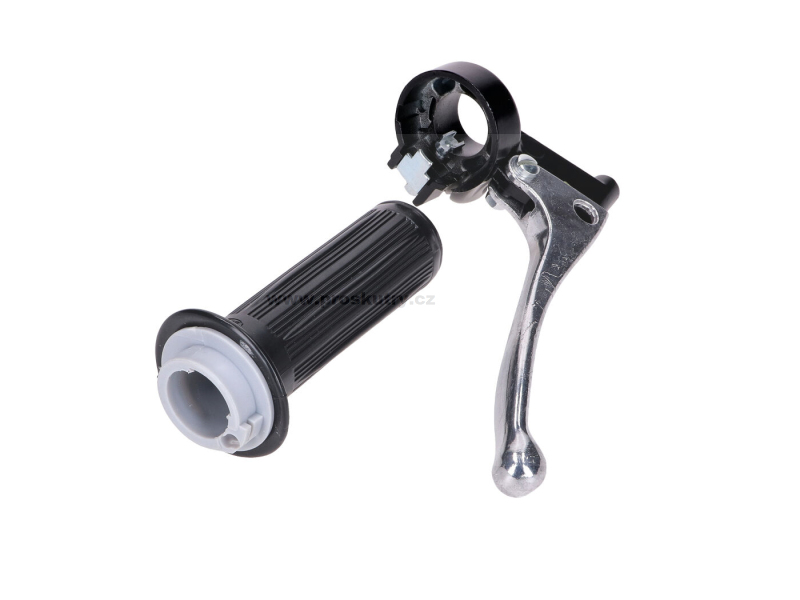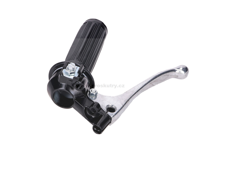 Kování rukojeti plynu s černou drážkovanou gumovou rukojetí a plnou hliníkovou spojkovou pákou, vhodné pro mopedy Zündapp, Kreidler, Hercules, Puch, DKW, KTM. Vhodné pro řídítka o průměru 22 mm, šířka úchopu cca. 105 mm, šířka řídítek cca. 26mm. Vybaven 8mm otvorem pro zrcátko bez závitu pro seřizovací šroub bowdenového lanka.