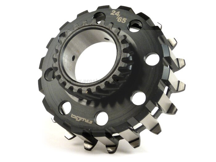 Šroubovitý speciální pastorek s 24 zuby je ideální pro plug-in motory, jako jsou Polini 210 nebo Malossi Sport. Umožňuje dále rozšířit dostupný rozsah otáček a dosáhnout vyšší maximální rychlosti. Výslovně jej však nedoporučujeme pro silně upravené motory s výkonem nad 25 koní/25 Nm. Konstrukce párování pastorků 24/65 to neumožňuje.