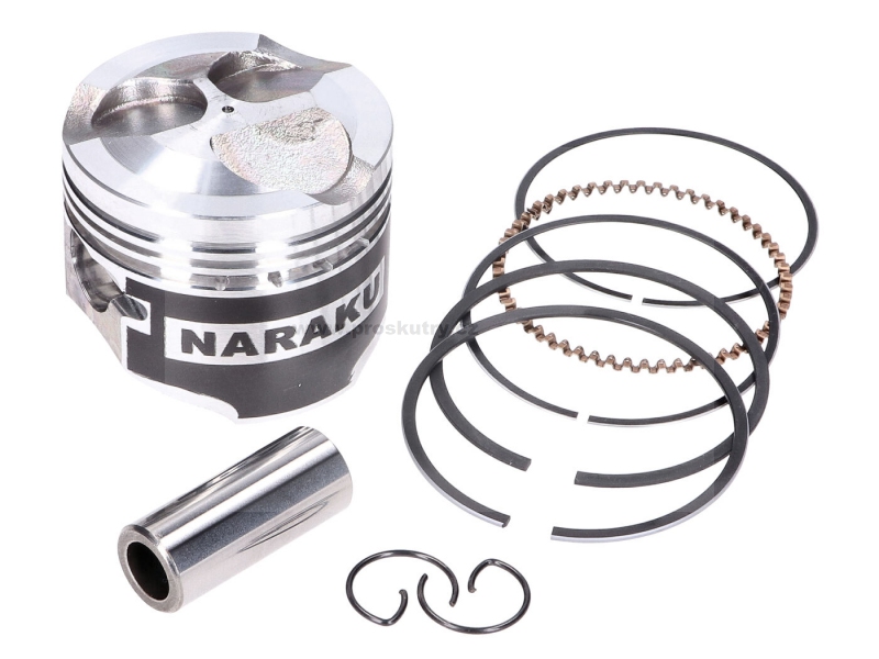 Kompletní sada pístů od Naraku pro sady 4-taktní 2-ventilové válce Piaggio včetně pístních kroužků, pístního čepu a pojistných svorek pístu.