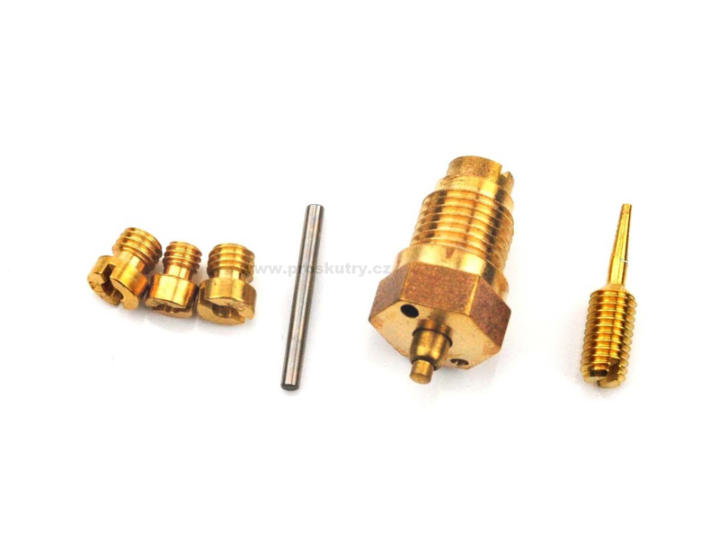 6dílná sada na opravu karburátoru vhodná pro karburátor BVF 16mm, používaná na Simson S 51. Obsahuje plovák, pojistný kolík, jehlu plováku, ventil, regulační šroub směsi, hlavní trysku (35,70) a volnoběžnou trysku (60).