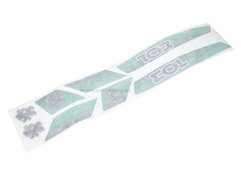 Sada 8 samolepek v zelené barvě určená pro moped Peugeot 103. Obsahuje motivy s logem lva Peugeot a označením „103“, ideální pro renovaci nebo obnovení původního vzhledu.