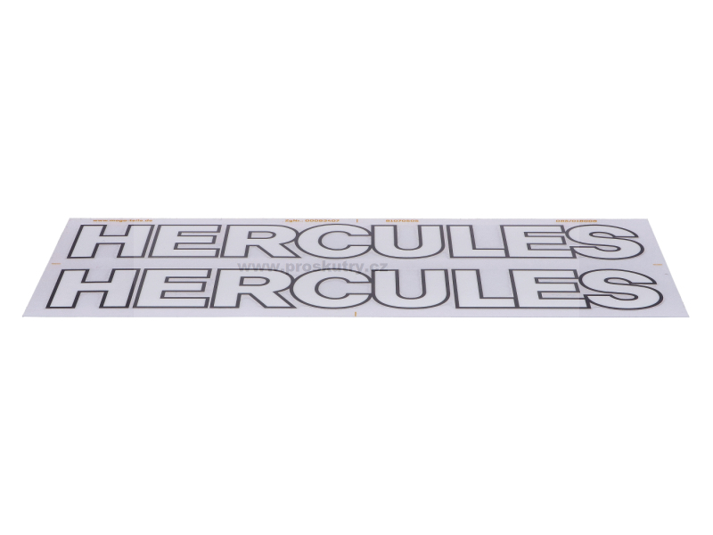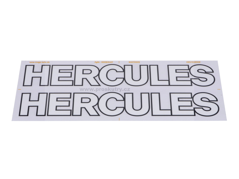 Dvoudílná sada samolepek s nápisem "Hercules" v černém a bílém provedení na nádrž, vhodná pro modely Hercules Prima 2N, Prima 4, Prima 4N, Prima 4S, Prima 5, Prima 5S, Prima SX, Prima G3, Supra 4.