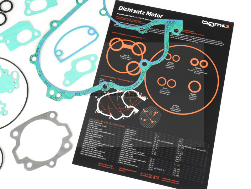 Sady silikonových těsnění BGM PRO se skládají z 0,5 mm silného, vysoce kvalitního potaženého těsnicího papíru (jako originální „zelený“ těsnicí papír Piaggio). Těsnění, která jsou neustále v kontaktu s olejem, jsou navíc opatřena předem nanesenou vrstvou silikonového tmelu. Tím se zvyšuje povrchový tlak těsnění. Silikonový tmel navíc díky trvale pružnému tmelu mnohem lépe těsní i studený motor. Motor tak zůstává neustále utěsněn a olej zůstává tam, kde má být a kde je potřeba.