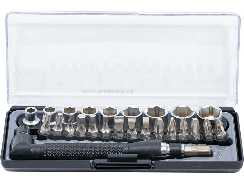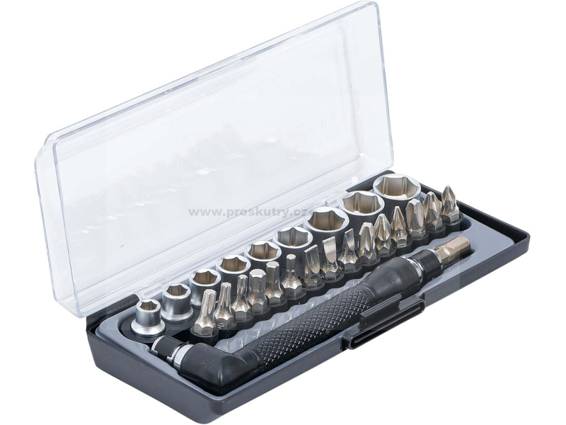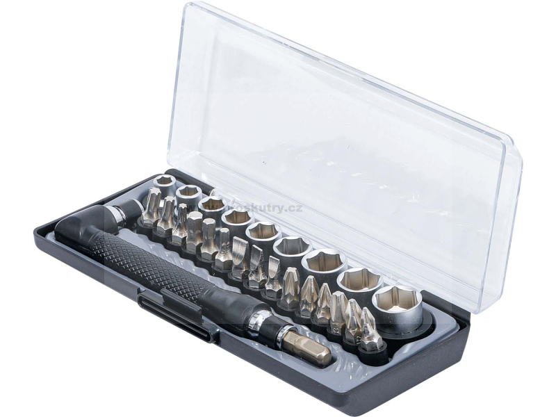 Sada obsahuje 26 dílů – kombinace bitů a nástrčných klíčů pro univerzální použití