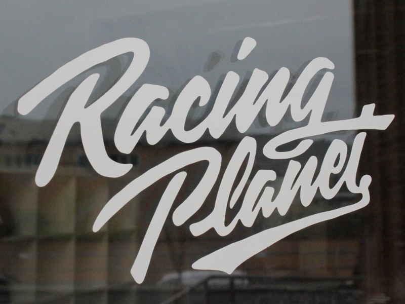 Bílá samolepka Racing Planet o rozměrech (ŠxV) 20x11,5 cm.