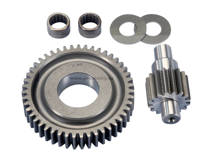 Polini sekundární převodovka s 16/47 zuby. Vhodný pro skútry s 50 ccm Piaggio 2-taktním motorem z roku výroby 1999 s mezikruží 17,7 mm a lisovaným pastorkem.