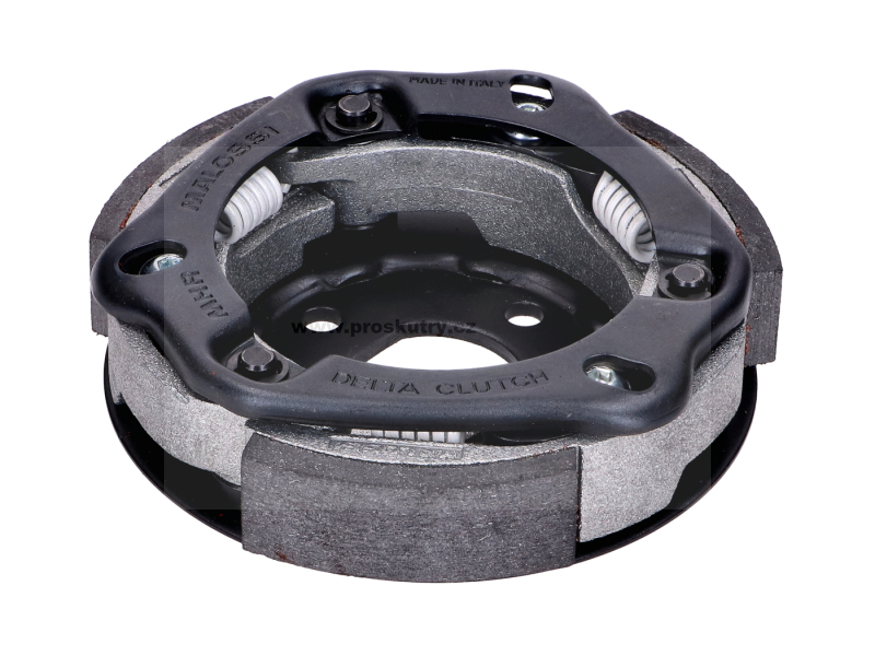 Spojková sada Malossi Delta Clutch System, vhodná pro motory Minarelli o objemu 107 mm. Princip odstředivé spojky je jednoduchý, ale zásadní: nad definovanými otáčkami motoru se spojkové čelistky pohybují směrem ven, zachytí se o pouzdro spojky a přenášejí výkon motoru přímo do převodovky. S touto sadou Malossi kombinuje dva dokonale sladěné komponenty pro optimalizovaný přenos výkonu. Spojka Delta: Spojka Delta je nastavitelná tříčelisťová závodní spojka navržená speciálně pro odolnost a přesnost. Velkoryse dimenzovaná obložení s optimalizovaným třením znatelně snižují prokluzování. Obzvláště flexibilní: systém lze jemně doladit ve třech stupních pomocí různých pevností pružin a systému posuvníků pro individuální nastavení chování při záběru. Spojkový zvon: Hlubokotažené pouzdro spojkového zvonu vyrobené z oceli P04 slouží jako ideální doplněk. Dynamické vyvážení a speciální antivibrační svařování zajišťují plynulý chod hnacího ústrojí. Nitridem kalený povrch také zlepšuje absorpci tepla a chrání materiál před předčasným opotřebením.
