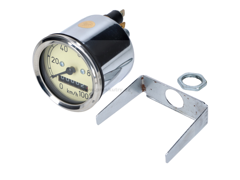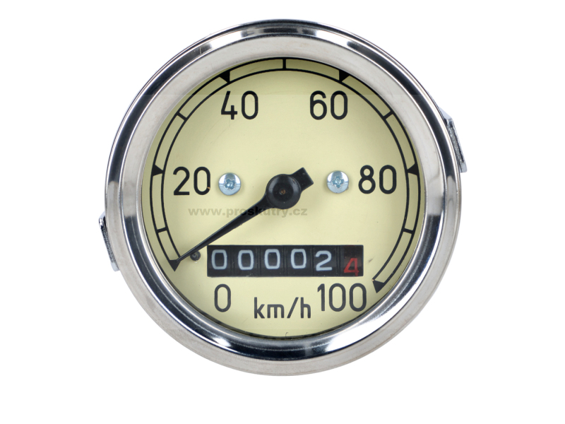 Klasický analogový tachometr s rozsahem 0–100 km/h a průměrem 60 mm, určený pro motocykly MZ a skútry IWL. Díky chromovanému rámečku a béžovému (slonovinovému) ciferníku skvěle zapadne do vzhledu historických vozidel.