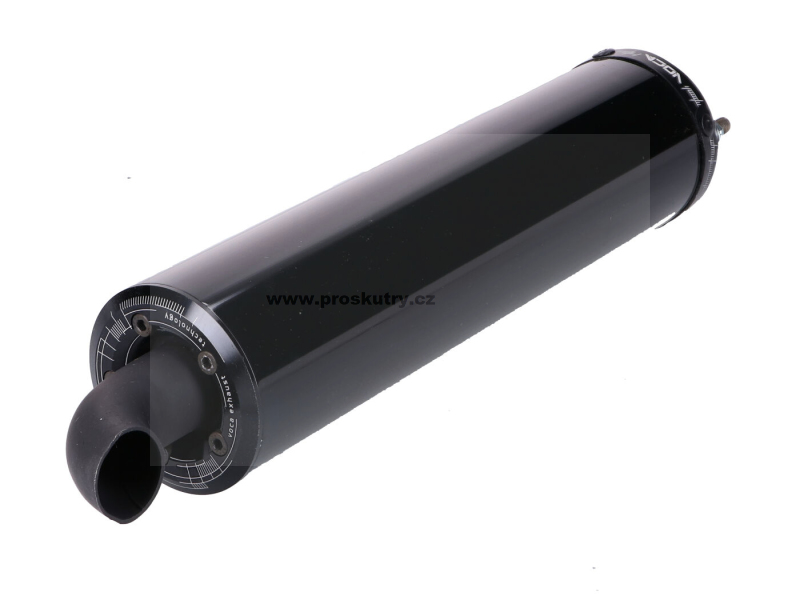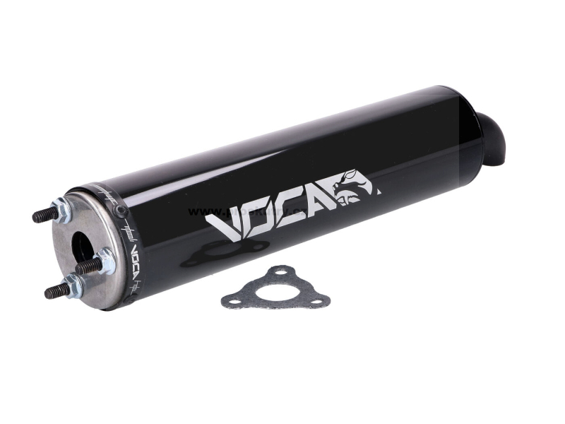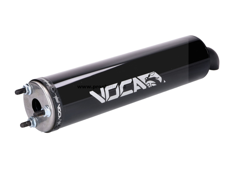 Černý tlumič výfuku od Voca Racing vhodný pro moto s převodovkou o objemu 50-70 ccm.