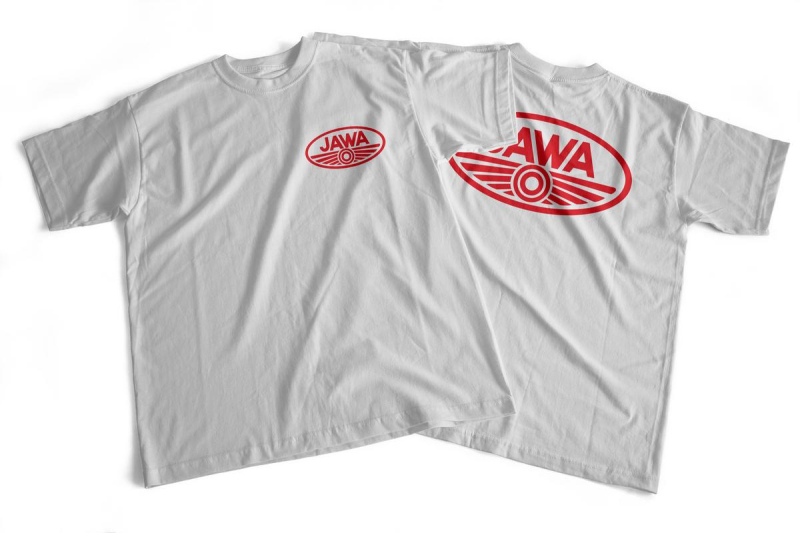 Bílé bavlněné tričko s potiskem loga JAWA na srdci na zádech. Logo JAWA je na tričku natisknuto semišovým „chlupatým“ termotransferovým flock potiskem.