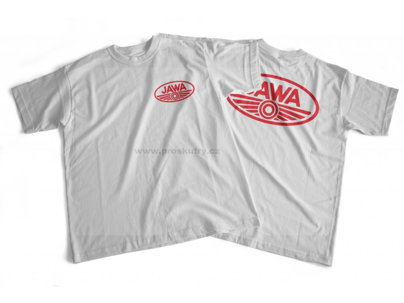Bílé bavlněné tričko s potiskem loga JAWA František Janeček (FJ) na srdci na zádech. Logo JAWA je na tričku natisknuto semišovým „chlupatým“ termotransferovým flock potiskem.