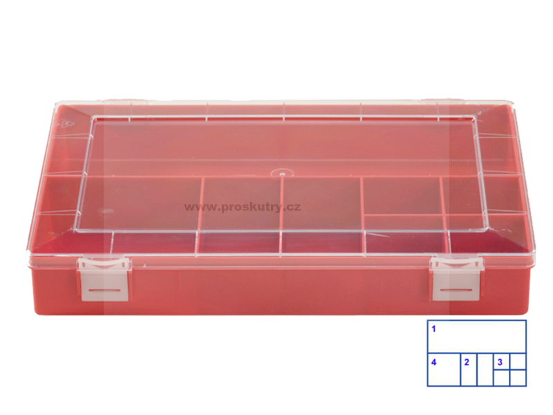 Rozměry vnitřních přihrádek (8 přihrádek ve 4 variantách, výška 40 mm): 1= 65x242mm 2= 98x38mm 3= 48x38mm 4= 98x80mm