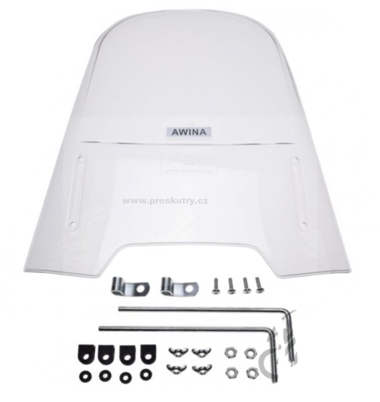 Univerzální čelní plexi (štít) o rozměrech 500 × 450 × 320 mm určené pro většinu čínských skútrů 50ccm, 125ccm a 150ccm.