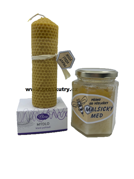 Skvělý dárek pod stromeček pro maminky a babičky, který potěší svou jemností i vůní. Sada obsahuje hýčkající mýdlo, svíčku ze včelího vosku a malý Malšický med přímo od včelařky z Malšic u Tábora. Ideální balíček plný přírodních produktů a lásky.