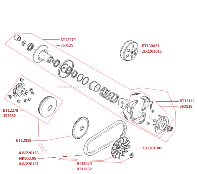 Variátor, spojka, řemen variátoru pro GY6 139 QMB/QMA 50 ccm 4T