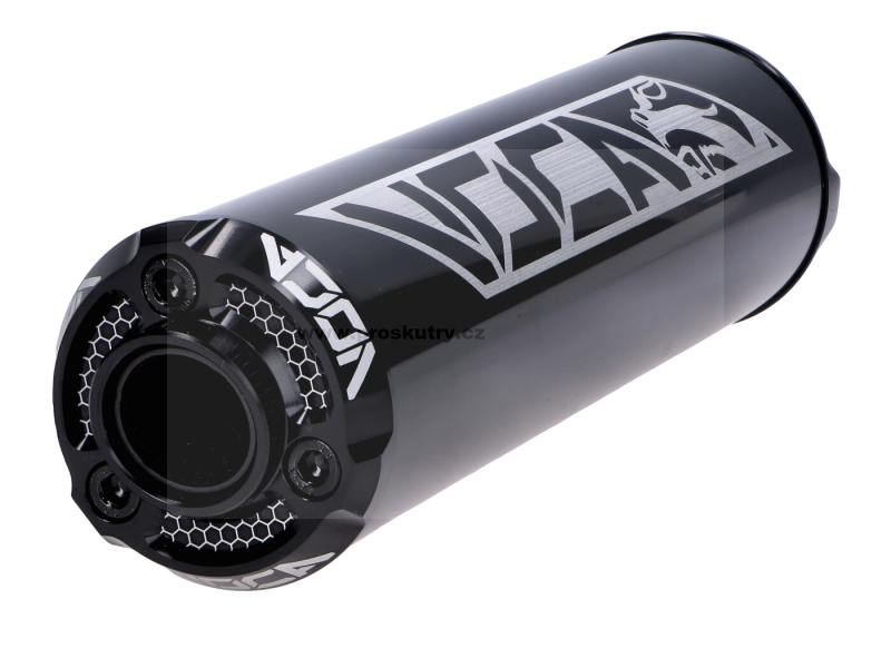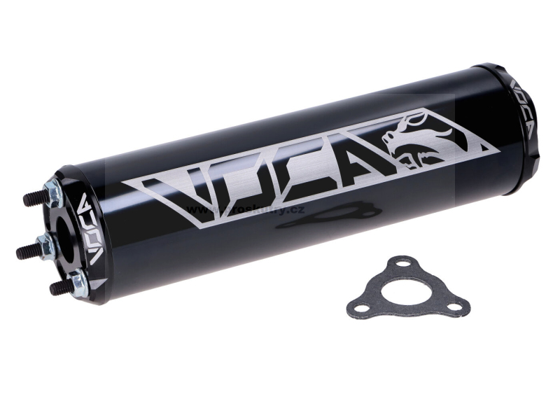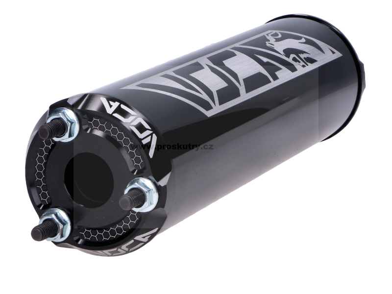 Tlumič výfuku VOCA s CNC hliníkovou koncovkou a krytem z eloxovaného hliníku.